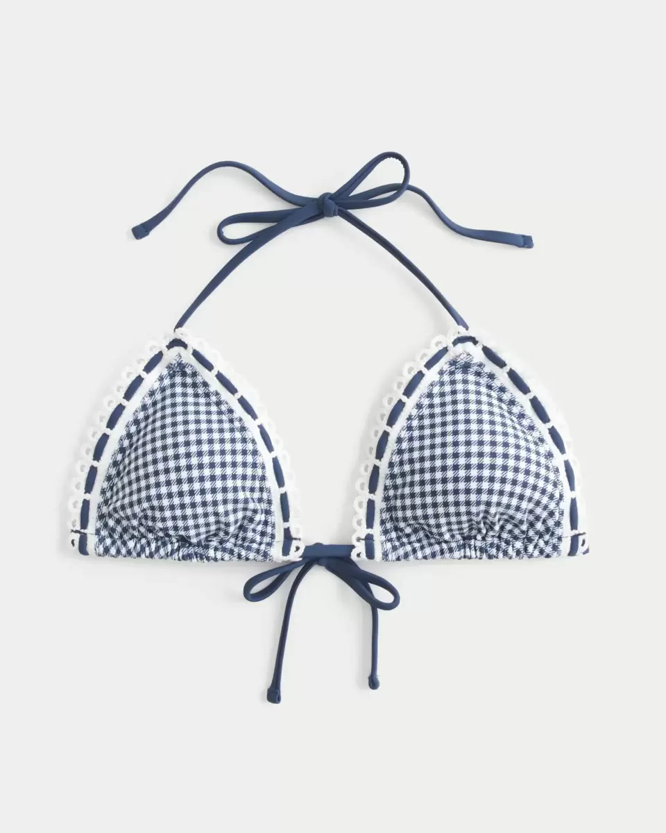 This cute bikini top is made with soft swim fabric and features a tie closure, crochet-style trim and removable padding. Classic triangle silhouette with halter ties. Imported.