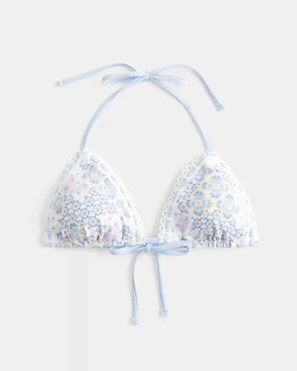 This cute bikini top is made with soft swim fabric and features a tie closure, crochet-style trim and removable padding. Classic triangle silhouette with halter ties. Imported.