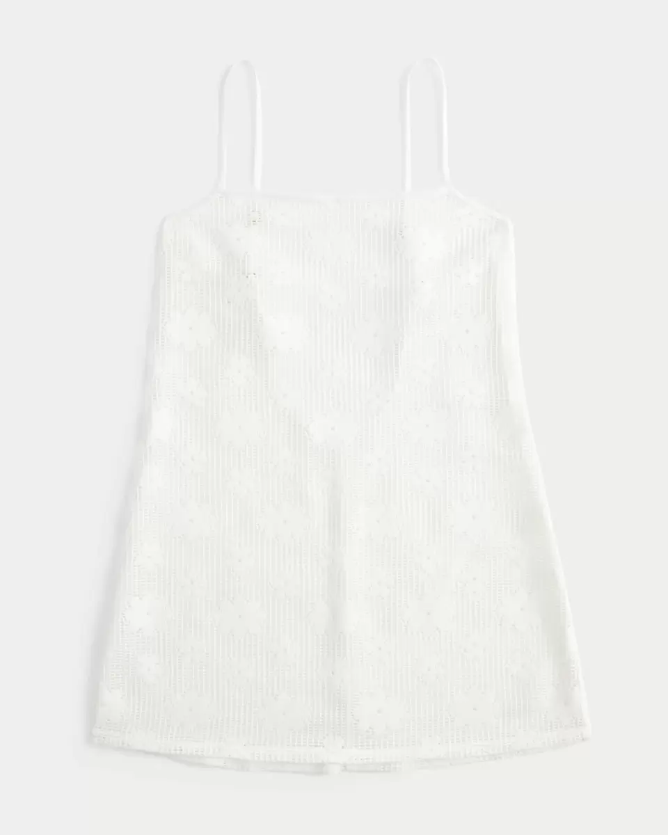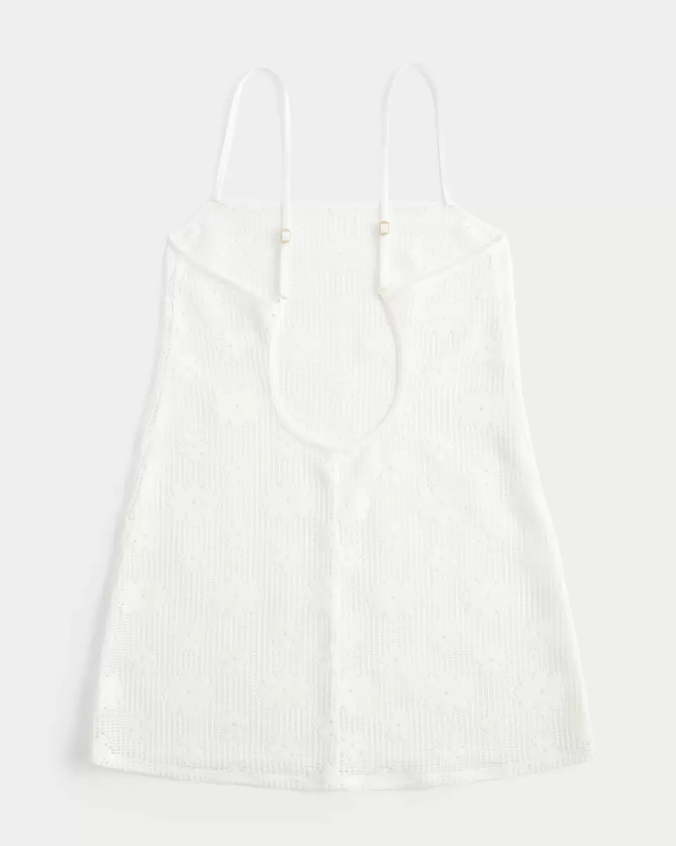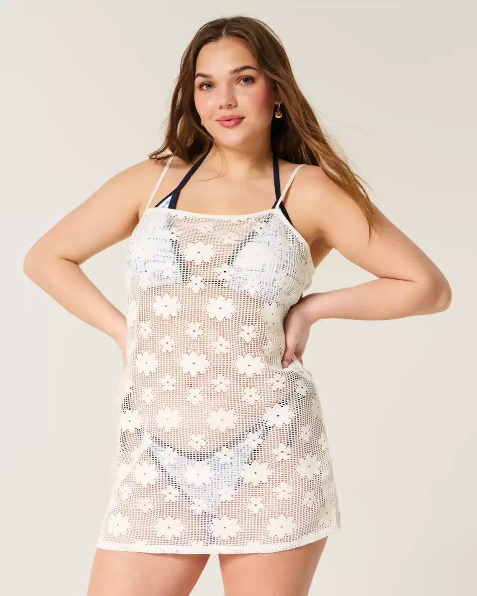 Pretty and super soft, this swim cover up dress is designed with an open stitch with an all-over floral pattern. Open back detail, skinny adjustable straps. Imported.