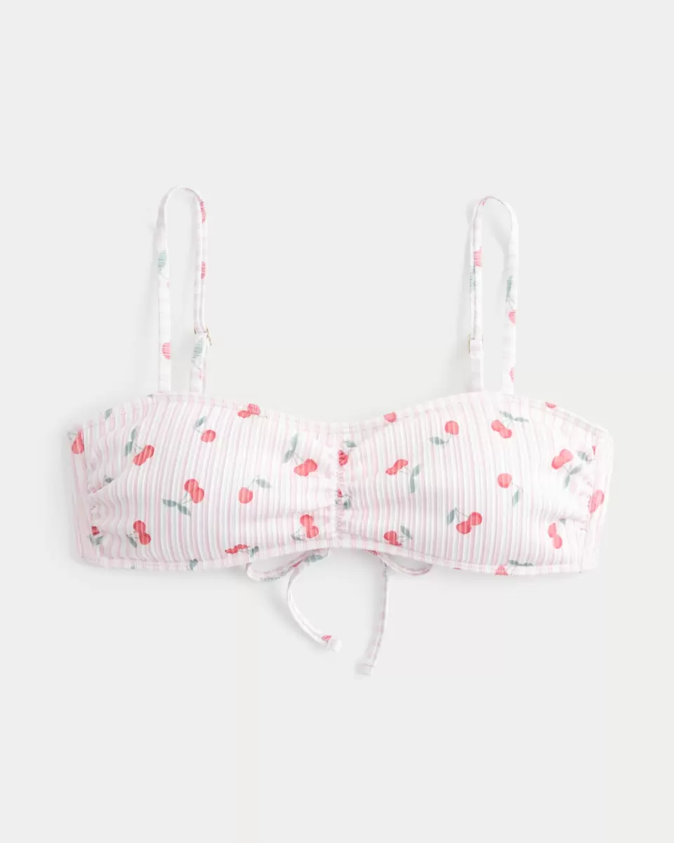 A super cute bikini top in soft ribbed swim fabric with a scoop neckline and cinched detailing at the center. Adjustable straps. Imported.