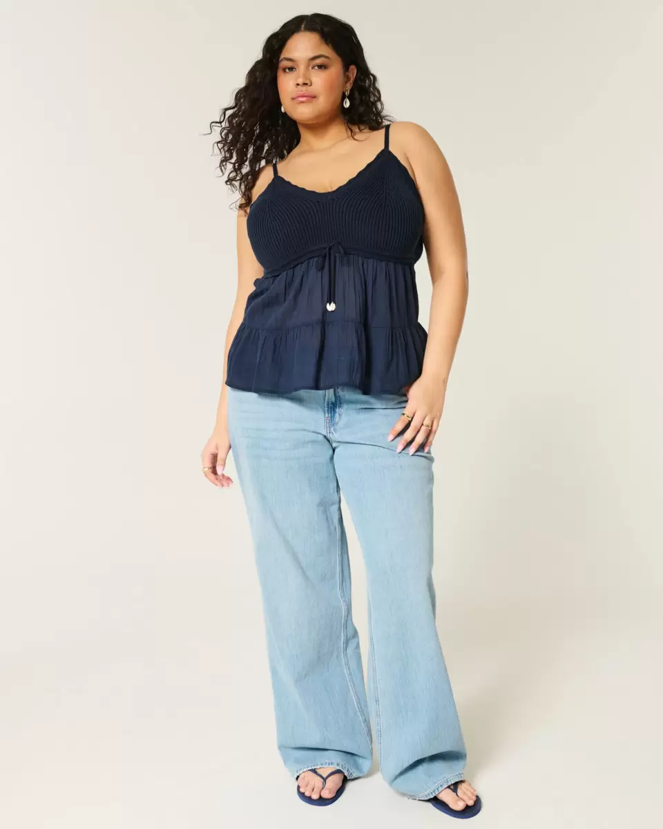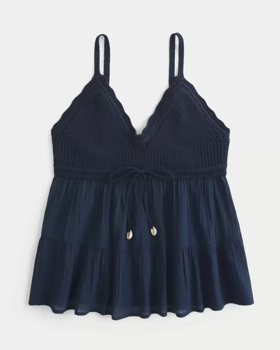 Pretty and super soft, this top features crochet-style fabric at the bust and a flowy fabric hem. Cute tie detail, scalloped trim at neckline. Imported.