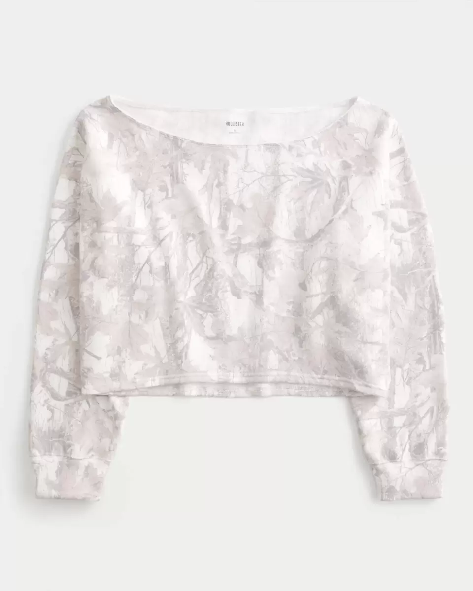 A super soft fleece sweatshirt with an all-over camo pattern and off-the-shoulder neckline. Long sleeves. Easy Fit. Imported.