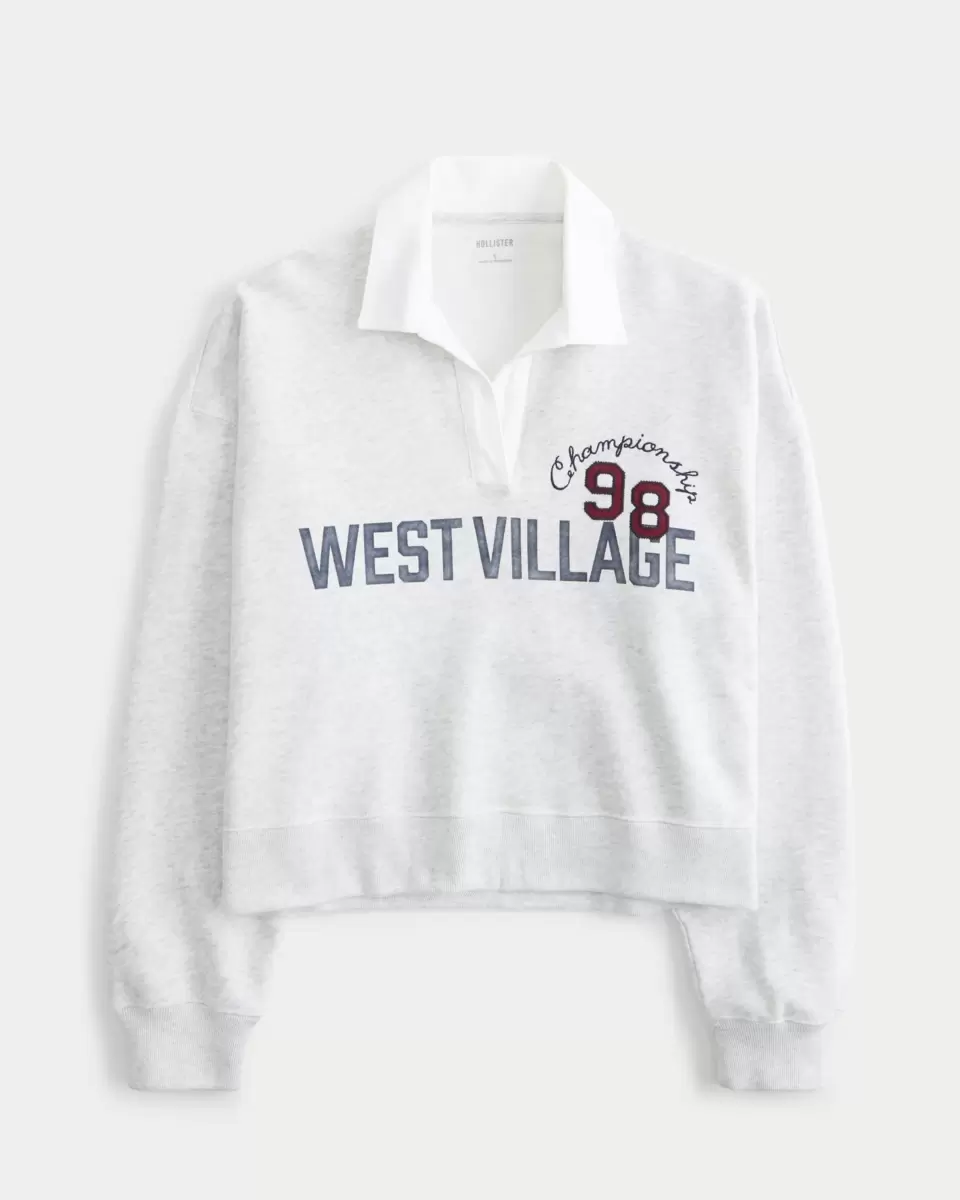 This cozy and super soft fleece rugby polo features West Village New York print graphics, applique and embroidery. Buttonless placket, collar, long sleeves. Easy Fit. Imported.