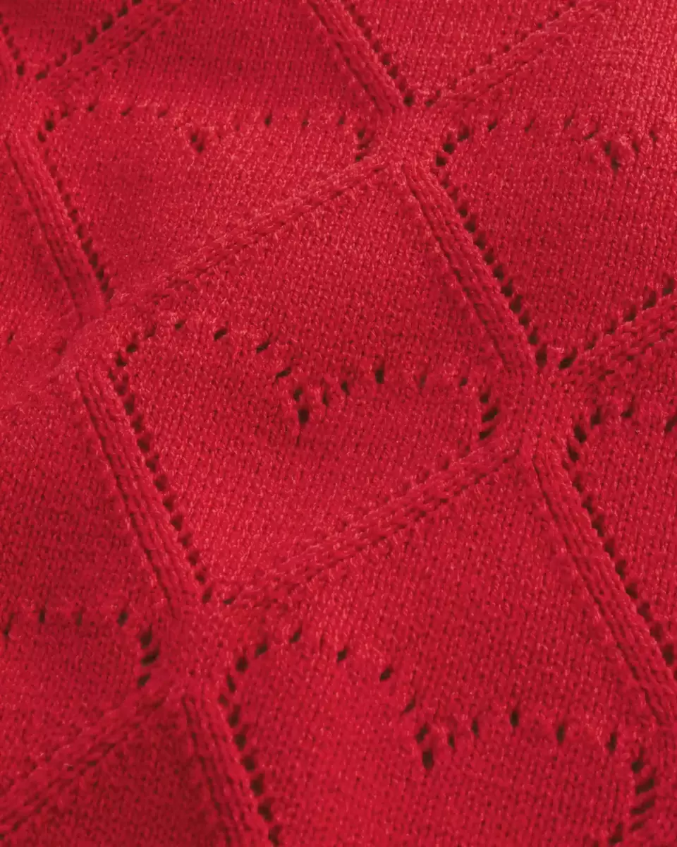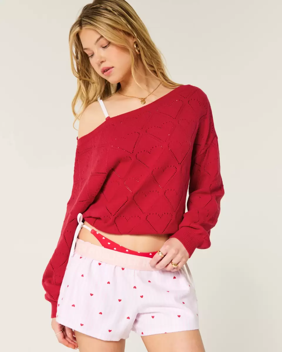 Cozy and super soft, this sweater features Valentine’s Day-inspired stitchy heart patterns. Relaxed neckline can be worn off one shoulder, ribbed trims, long sleeves. Easy Fit. Imported.