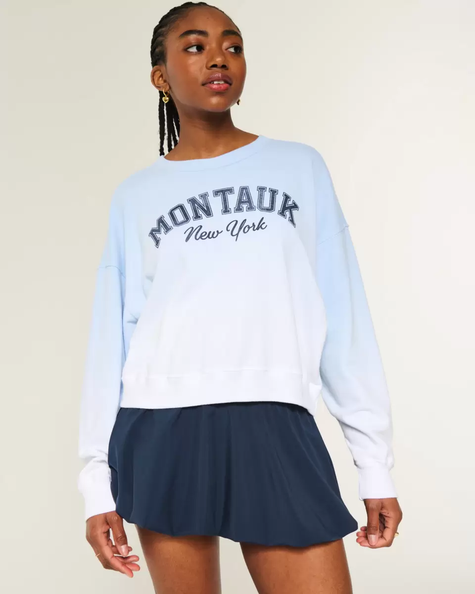A super soft fleece sweatshirt featuring a Montauk New York print graphic, crew neckline and long sleeves. Dip-dyed look. Easy Fit. Imported.