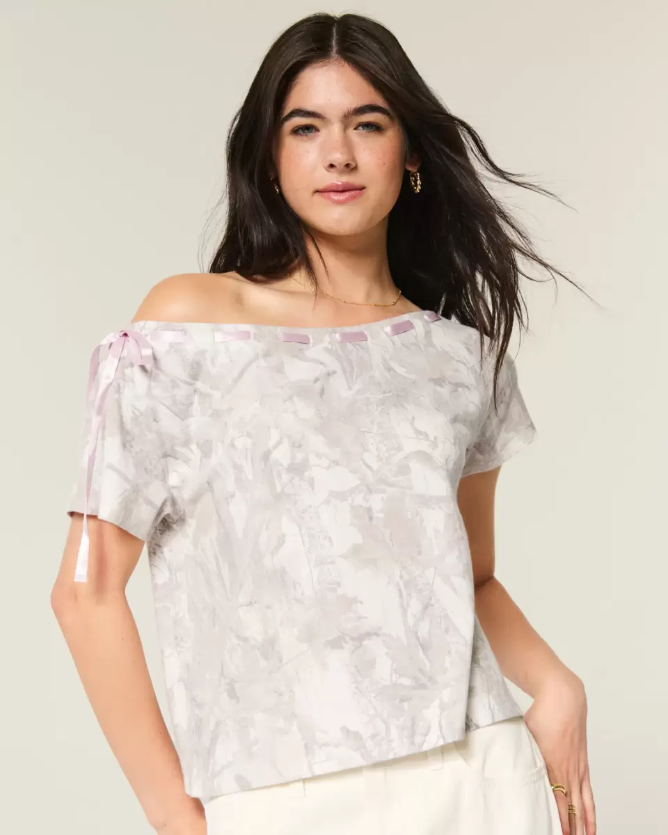 A super soft 100% cotton t-shirt with a pretty tie through the off-the-shoulder neckline. Short sleeves, all-over camo pattern. Easy Fit. Imported.