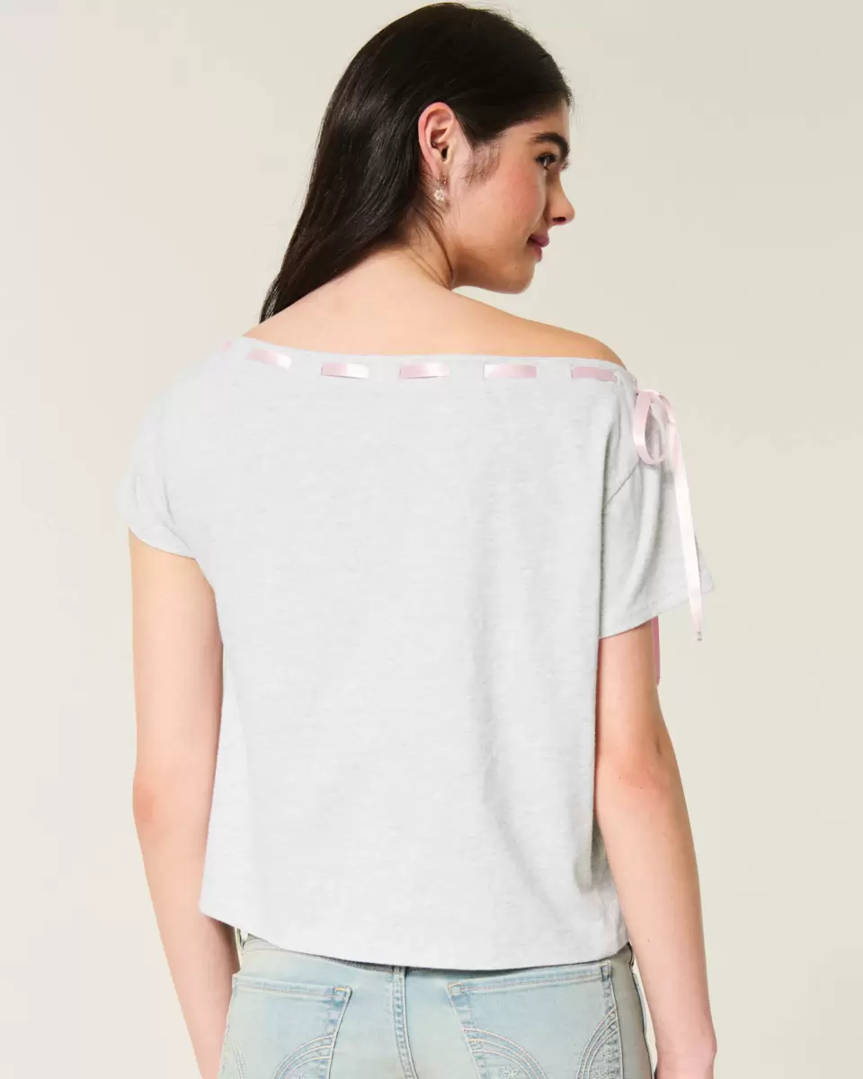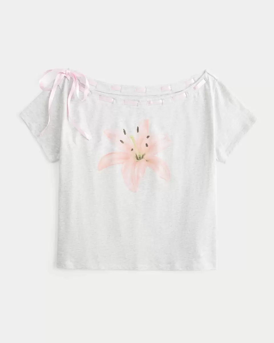 Made with super soft 100% cotton, this t-shirt features an off-the-shoulder neckline with a pretty tie detail. Cute floral graphic, short sleeves. Easy Fit. Imported.