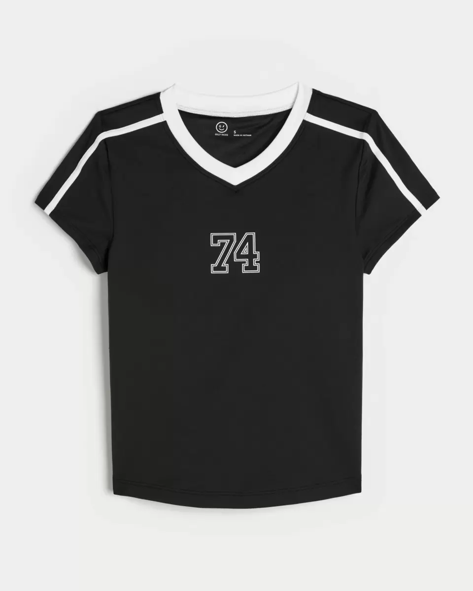 This super soft and comfy baby tee features a sporty print graphic and v-neckline. Short sleeves, built-in shelf bra with removable pads. Imported.