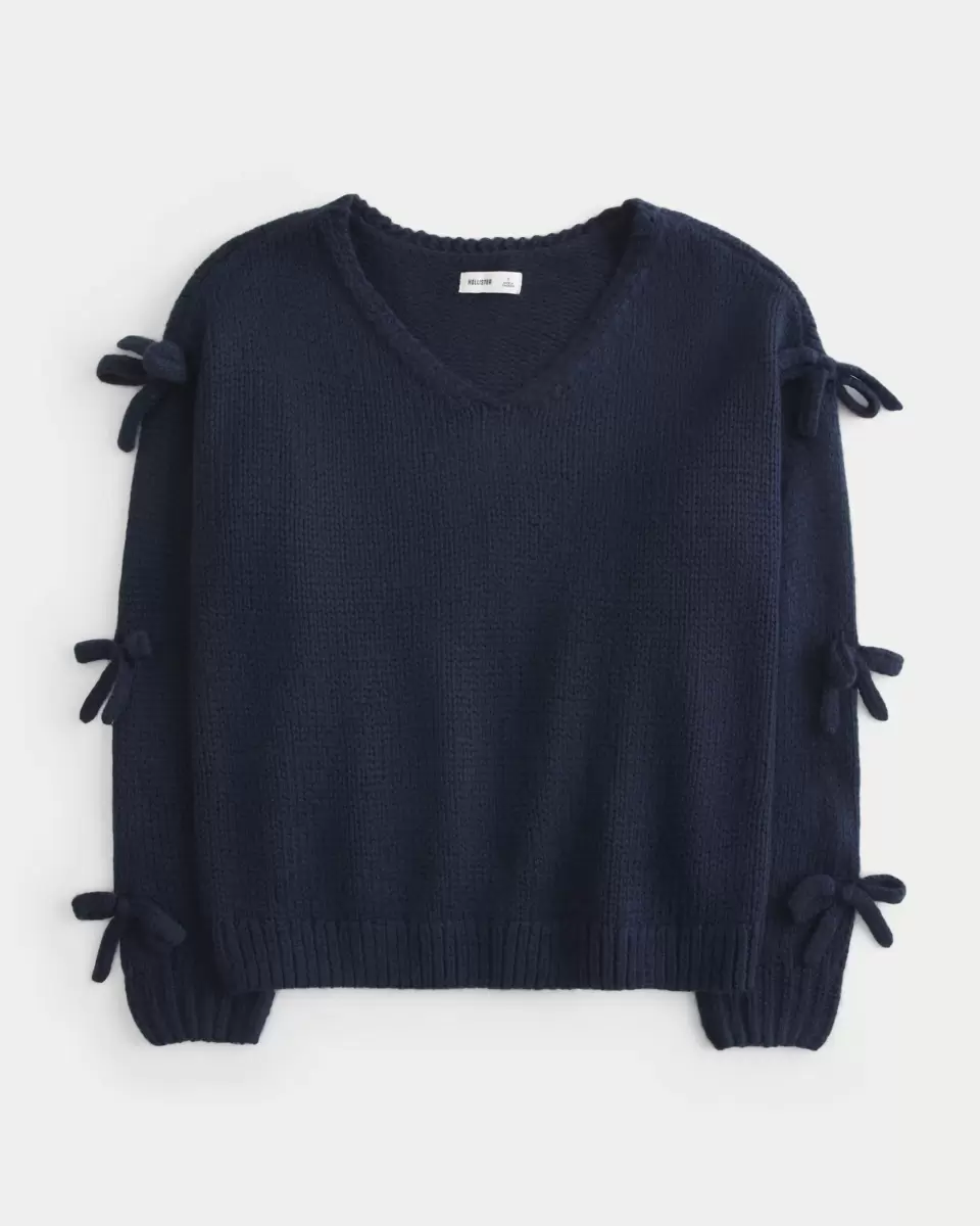 Super soft and unbelievably cozy, this sweater features bow applique details at the sleeves and a slouchy neckline that can be worn off one shoulder. Long sleeves, ribbed trims. Oversized Fit. Imported.