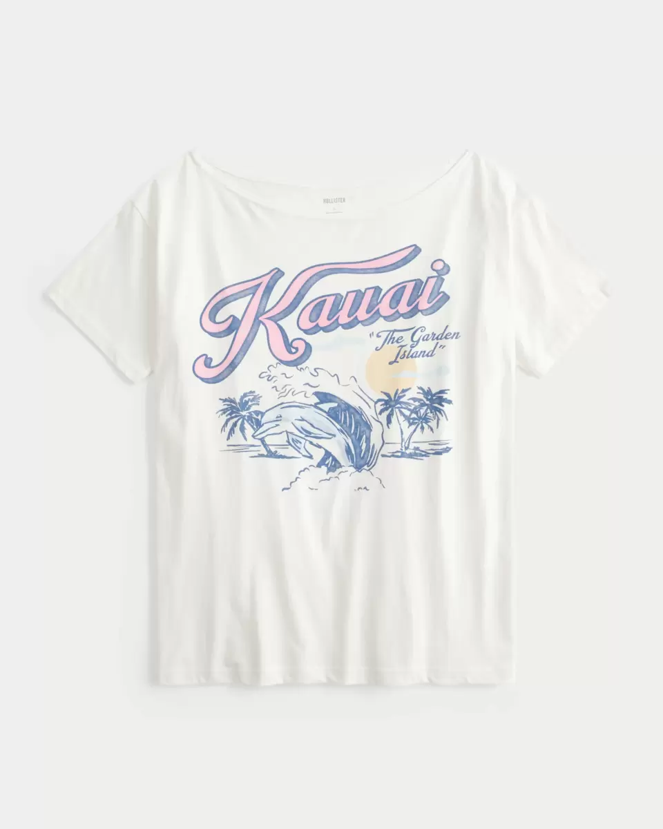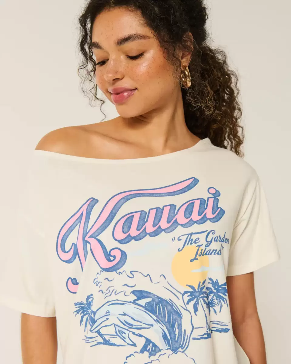 A super soft cotton tee featuring Kauai print graphics and an off-the-shoulder neckline. Short sleeves, longer length. Oversized Fit. Imported.