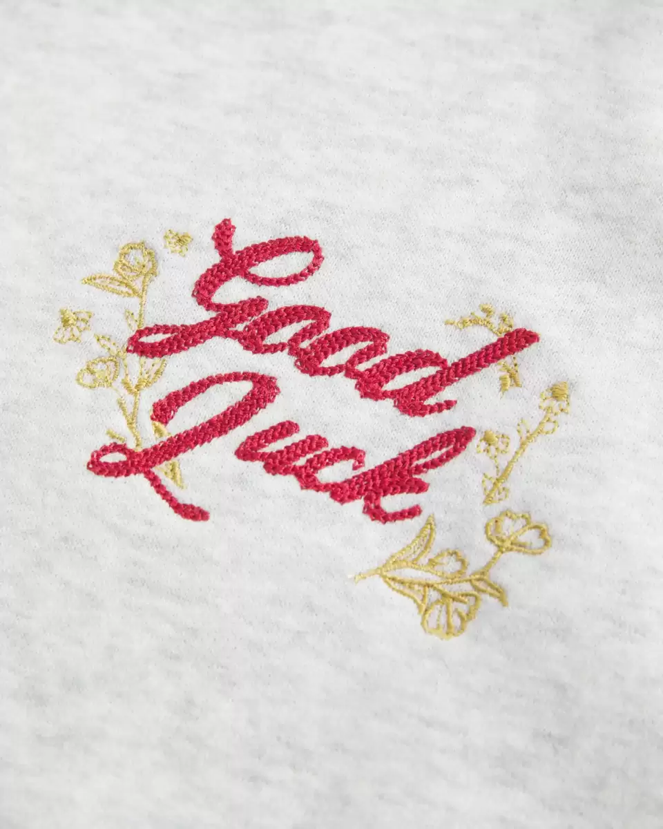 This super soft and cozy fleece sweatshirt features all-over Lunar New Year-inspired graphic embroidery with a Good Luck detail. Off-the-shoulder neckline, long sleeves. Oversized Fit. Imported.