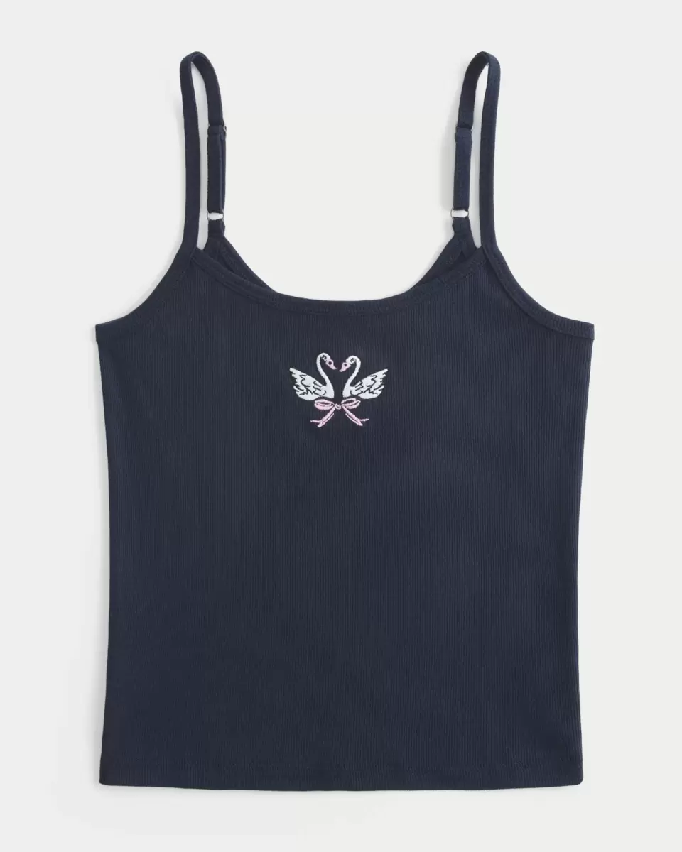 This cute cami is made with soft ribbed fabric and features swan graphic embroidery. Adjustable straps. Slim Fit. Imported.