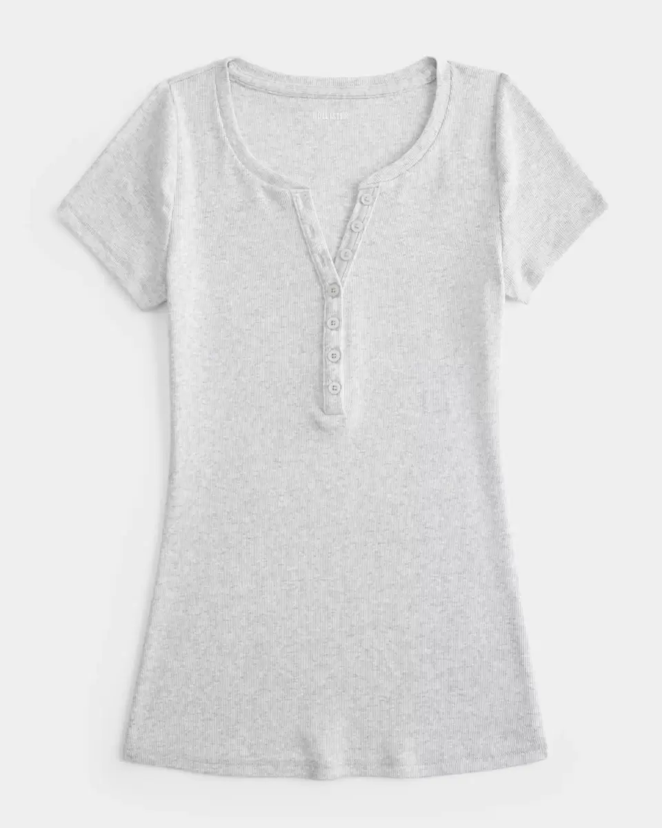 A super soft and comfy Y2K-inspired henley with short sleeves and a button placket. Longer length. Slim Fit. Imported.