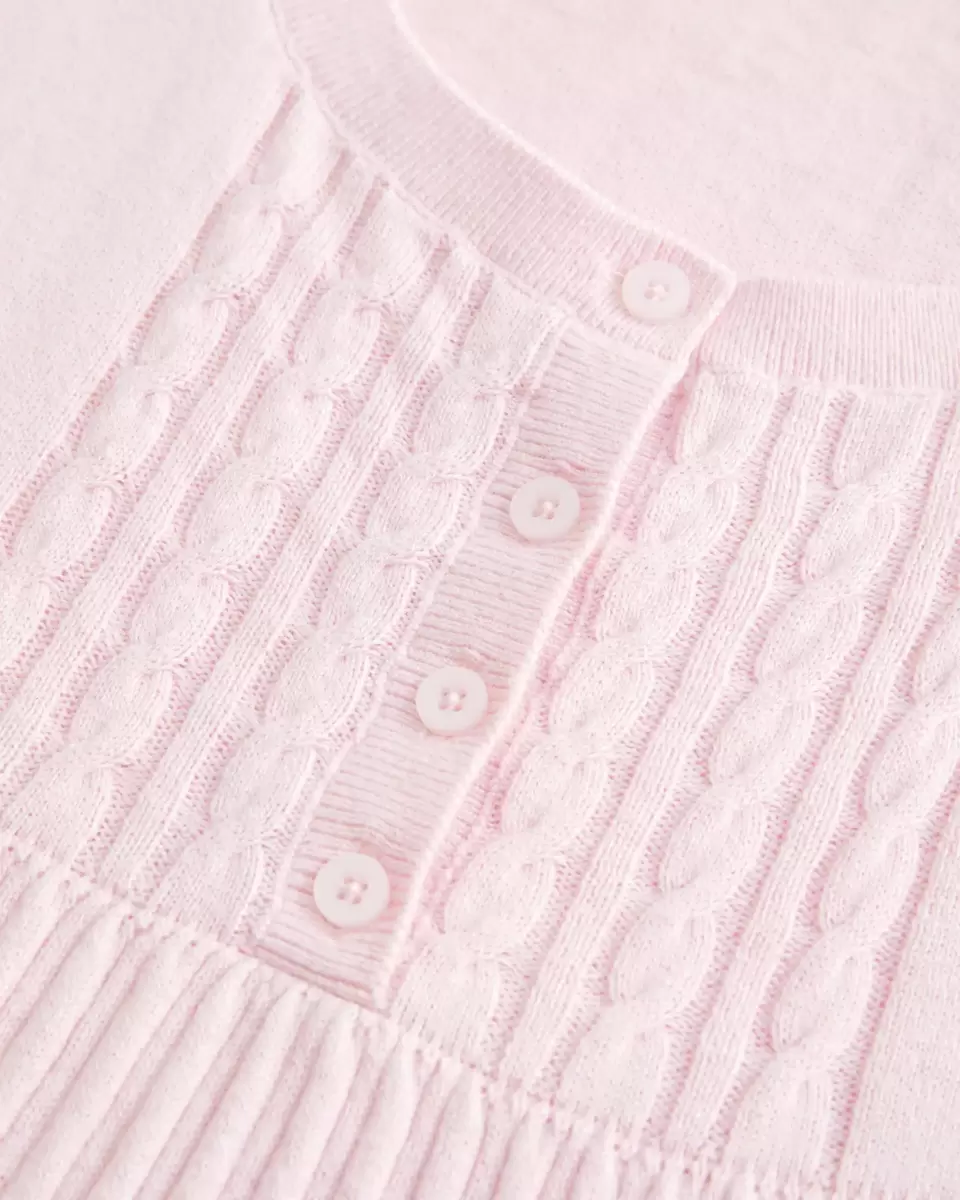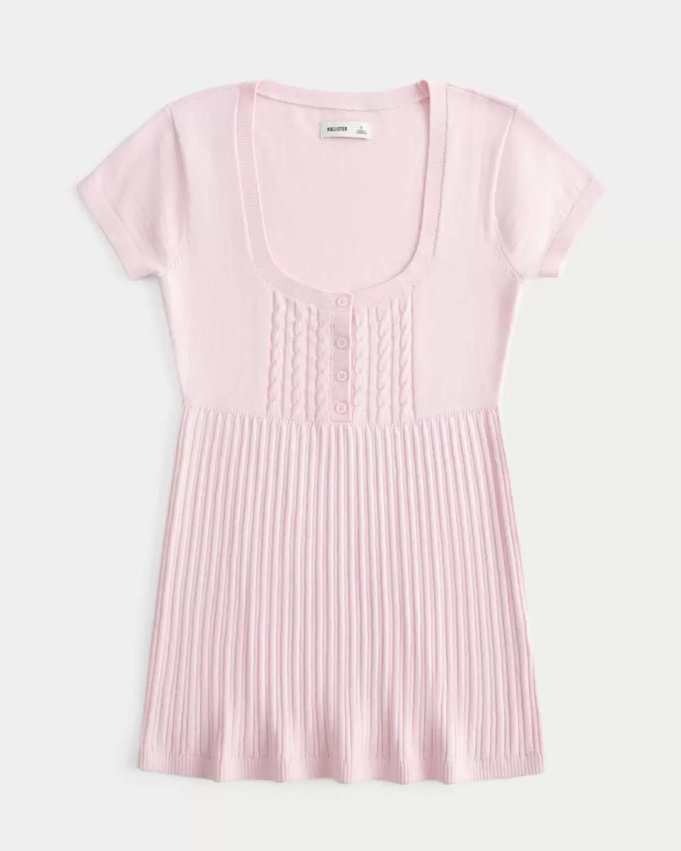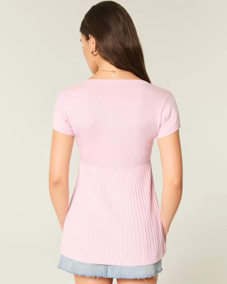 Perfect for layering with a cami or on its own, this cozy and super soft Y2K-inspired henley babydoll top features a flowy hem with ribbed texture, short sleeves and a button placket. Longer length. Imported.