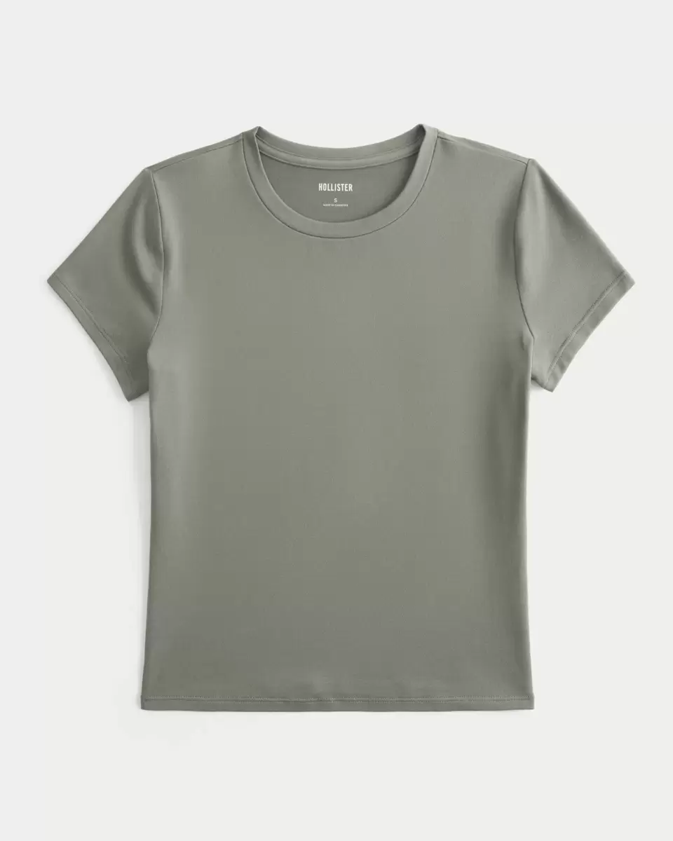 Cute and comfy, this baby tee is made with soft stretch fabric with a seamless look and feel. Crew neckline, short sleeves. Slim Fit.