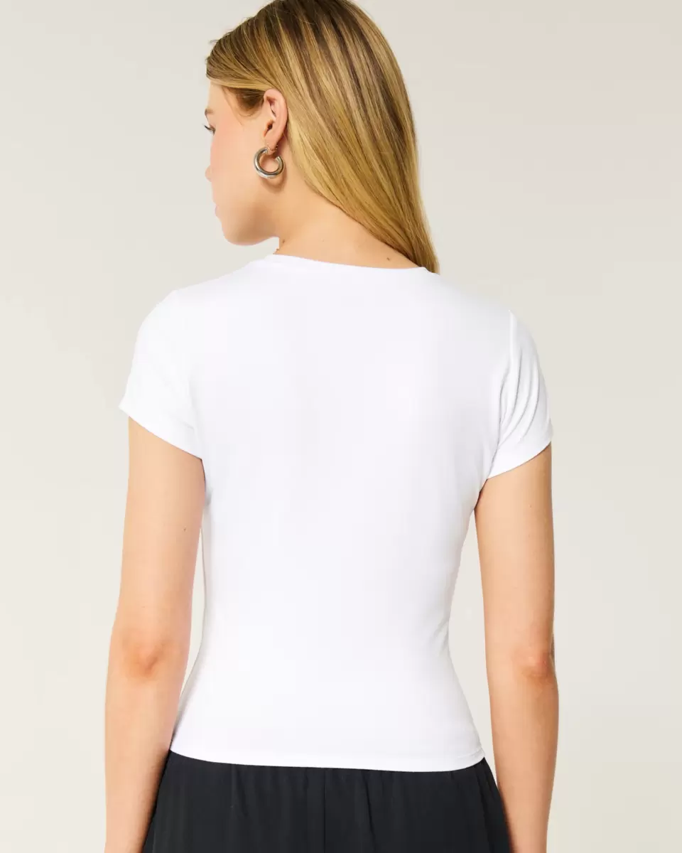 This cute and comfy baby tee is made with soft stretch fabric with a seamless look and feel. Longline silhouette, crew neckline, short sleeves.
