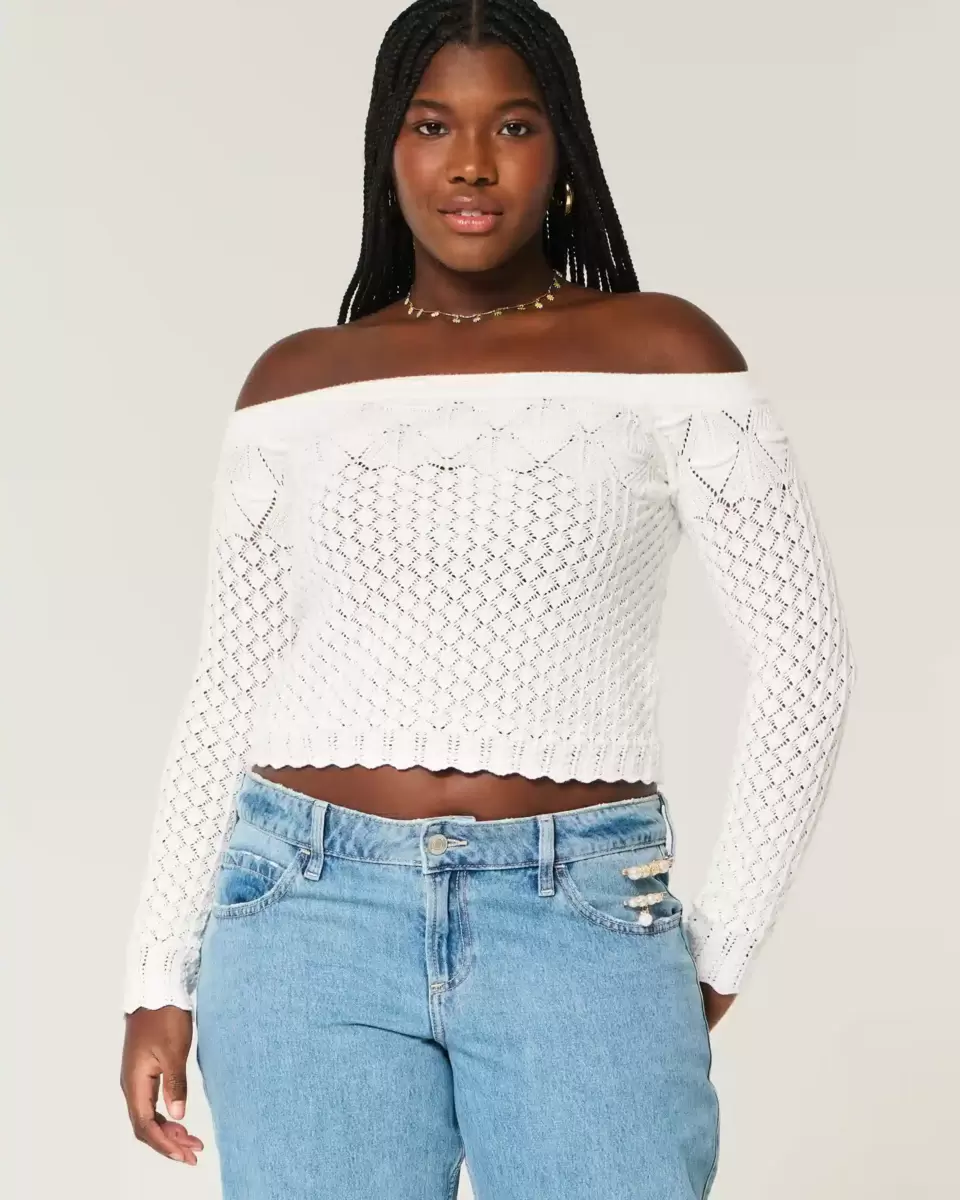 This super soft sweater is made with cozy crochet-style fabric with stitchy texture and features an off-the-shoulder neckline. Ribbed neckline, long sleeves. Slim Fit. Imported.