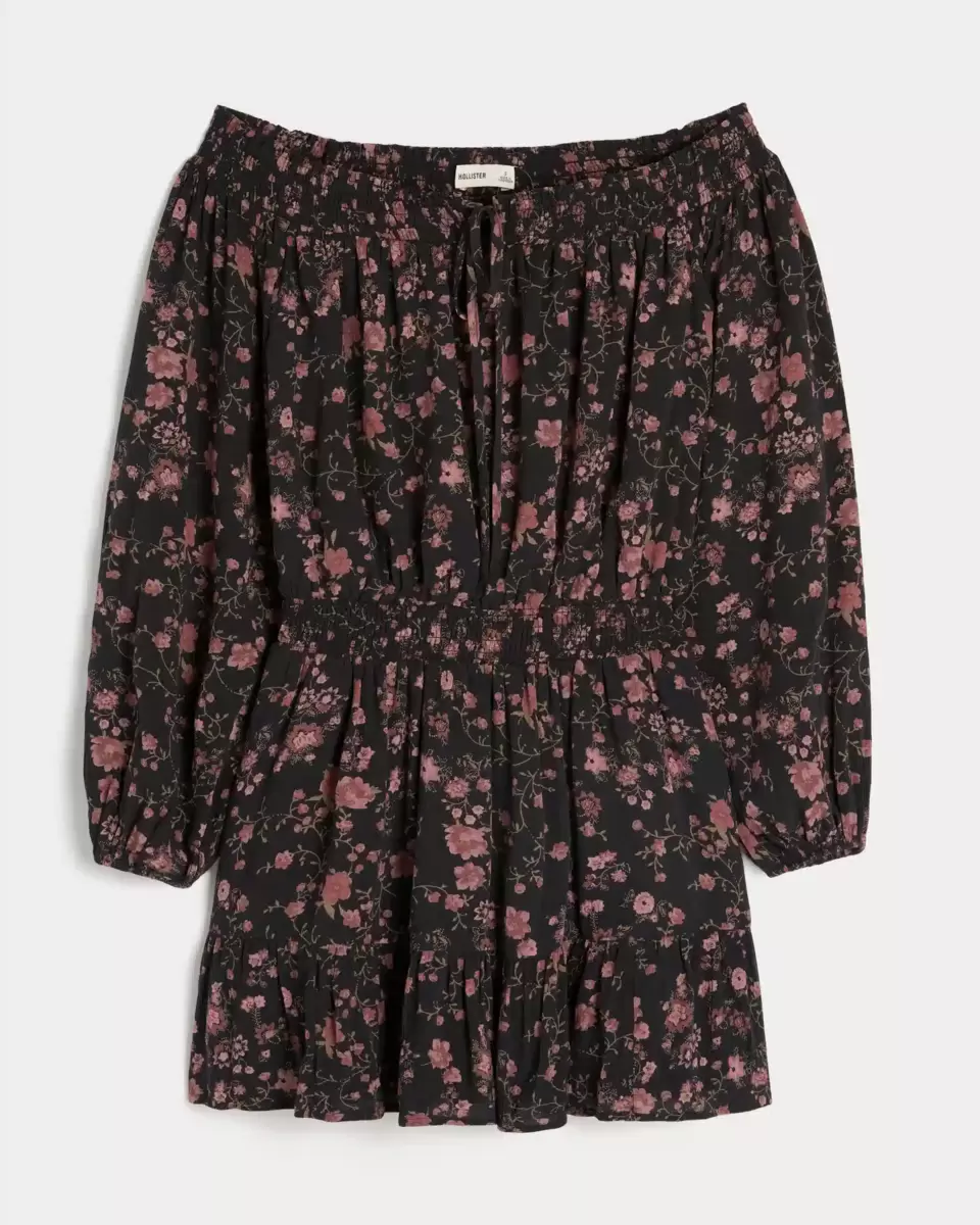 A flowy and super soft dress featuring a relaxed neckline that can be worn on or off the shoulder. Center tie detail at neckline, long sleeves, all-over pattern. Imported.