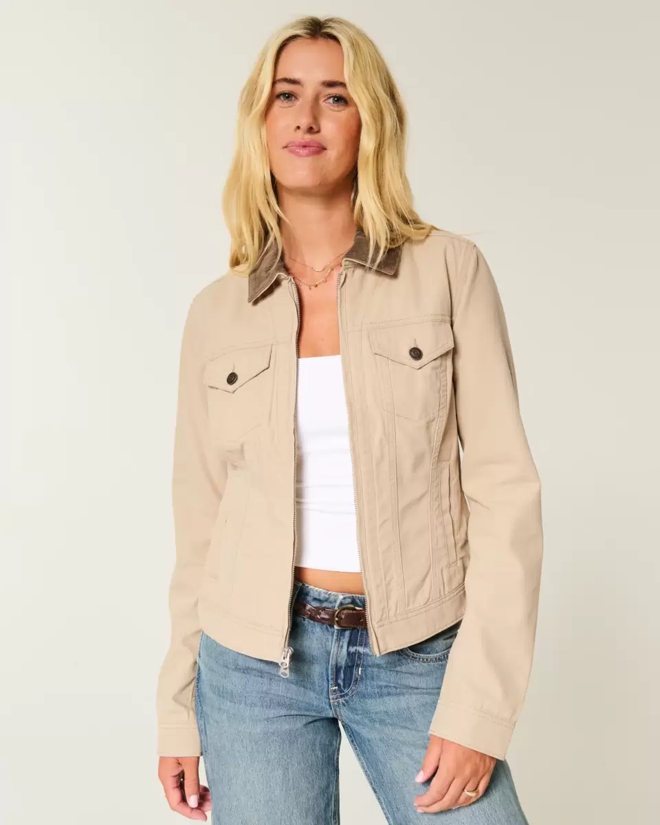 A classic Y2K-inspired twill jacket with a full zip-up closure. Chest pockets, front pockets, corduroy collar. Imported.