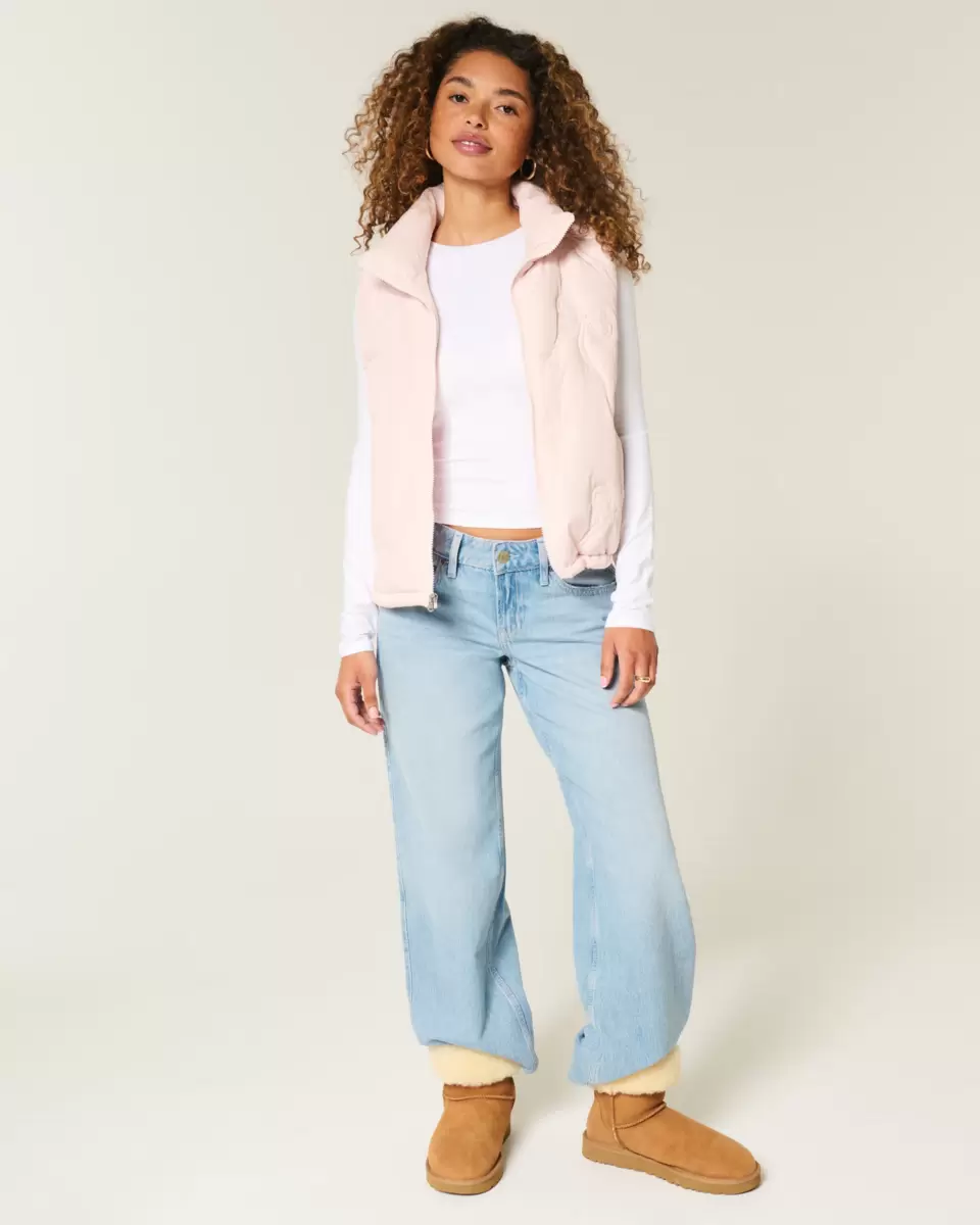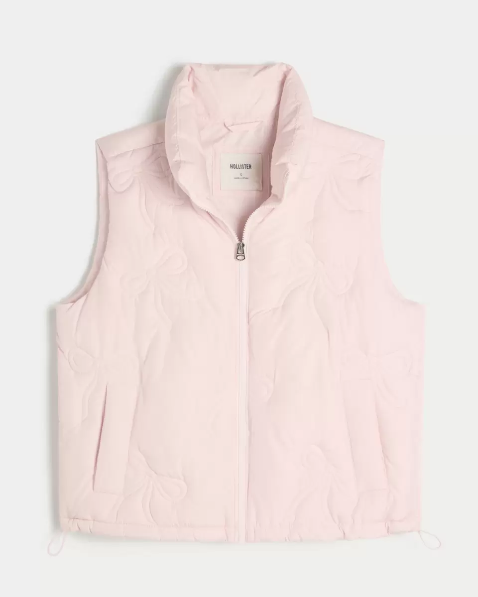 This cozy puffer vest features an all-over stitched bow pattern and full zip-up closure. Drawcord hem, mock-neck collar, pockets. Imported.