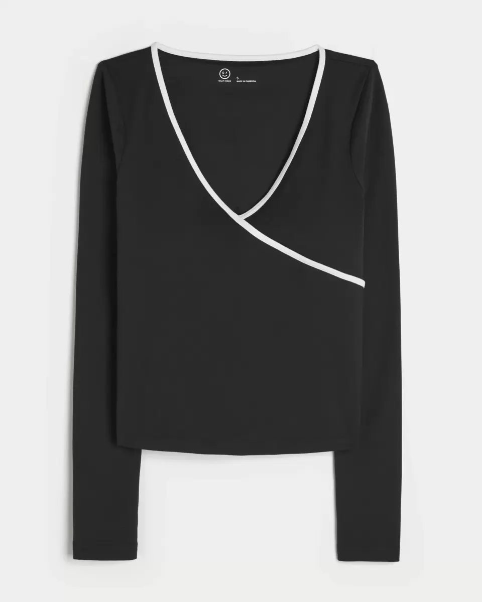 Cute and super soft, this active top features tipped trims and a wrap-style front detail. V-neckline, built-in shelf bra with removable pads. Imported.