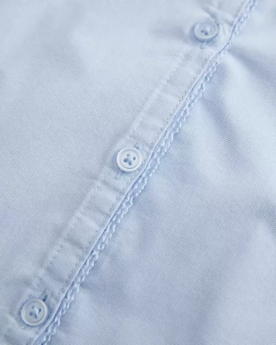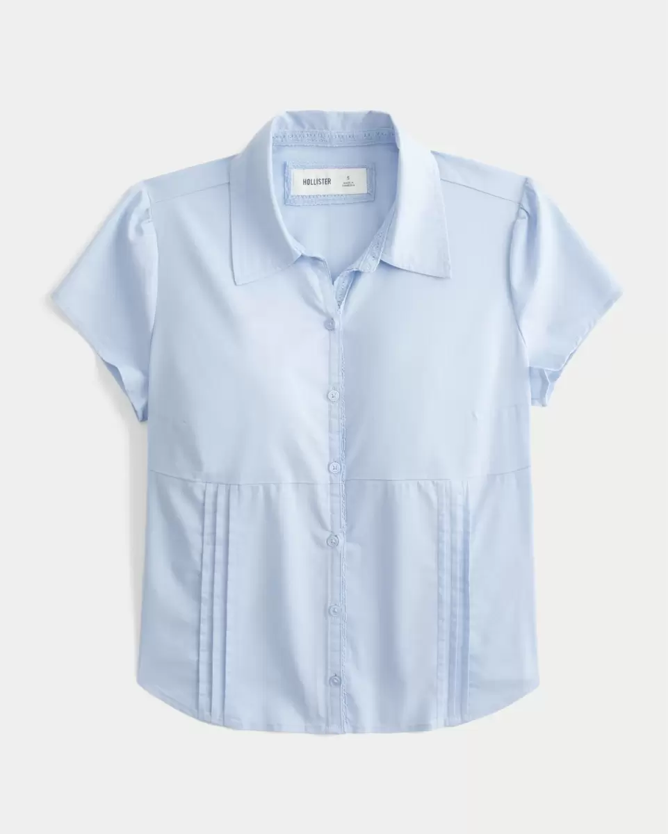 A Y2K-inspired short-sleeve button-through shirt in stretch poplin fabric, featuring pintuck pleats and interior lace detailing along the button closure. Back tie detail, looks per
