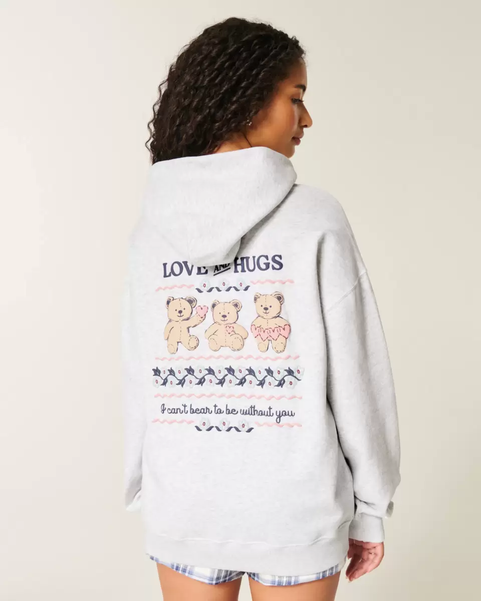 A super soft fleece hoodie featuring teddy bear graphics at the front and back. Hood, front pouch pocket, long sleeves. Imported.