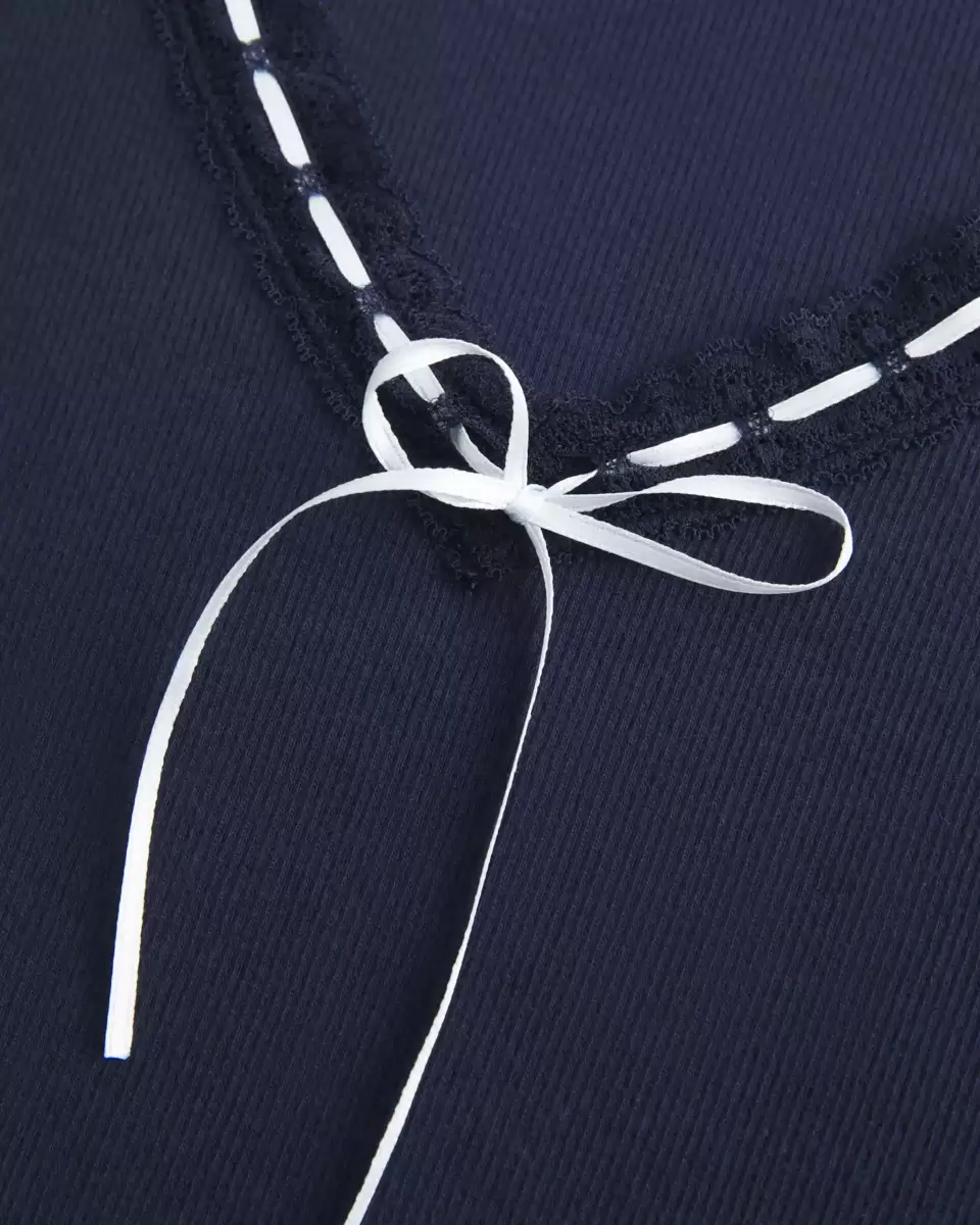 Super soft and comfy, this top features pretty lace trim along the neckline with an interwoven tie detail. Long sleeves. Imported.