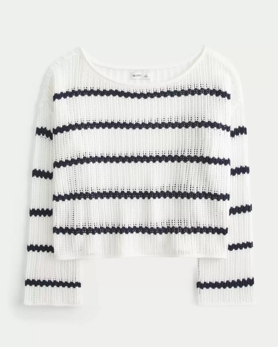 A super soft sweater in crochet-style fabric, featuring stitchy texture and a striped pattern. Relaxed crew neckline, long sleeves. Easy Fit. Imported.