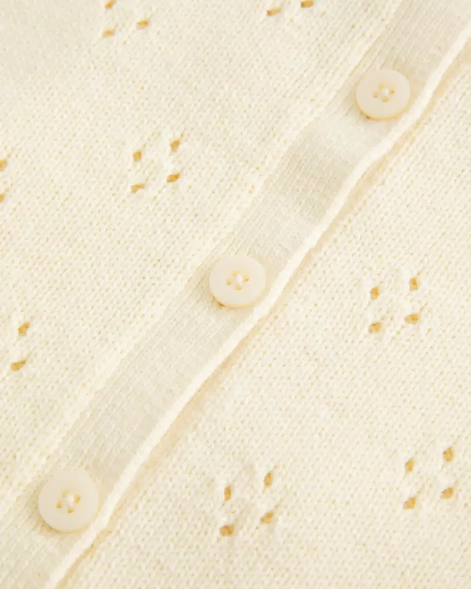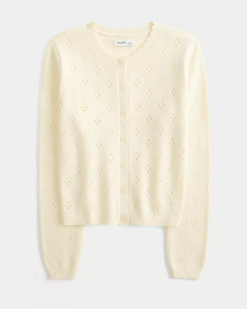 A cozy and super soft cardigan with pretty all-over eyelett patterns and a scalloped crew neckline. Full button closure, ribbed trims, long sleeves. Imported.