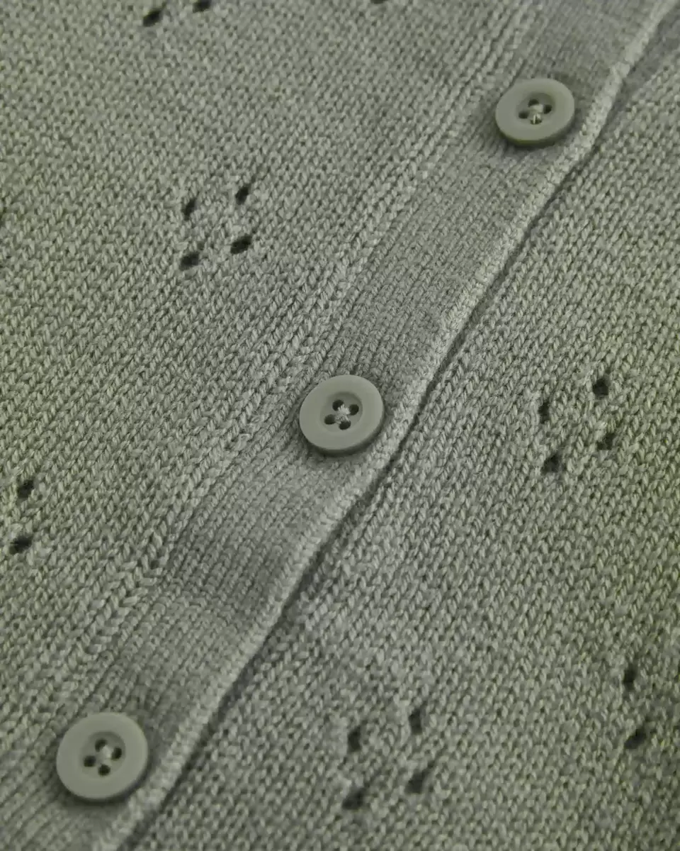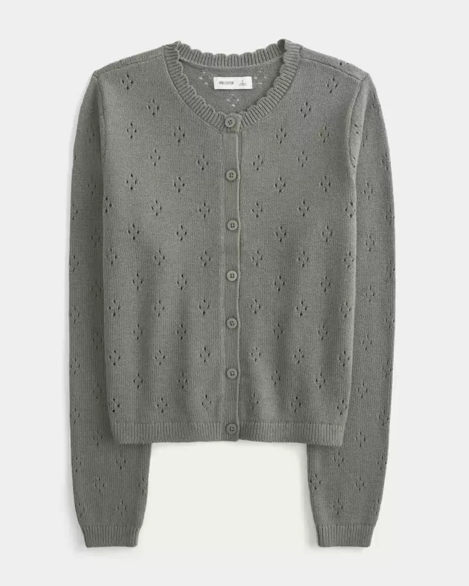 A cozy and super soft cardigan with pretty all-over eyelett patterns and a scalloped crew neckline. Full button closure, ribbed trims, long sleeves. Imported.
