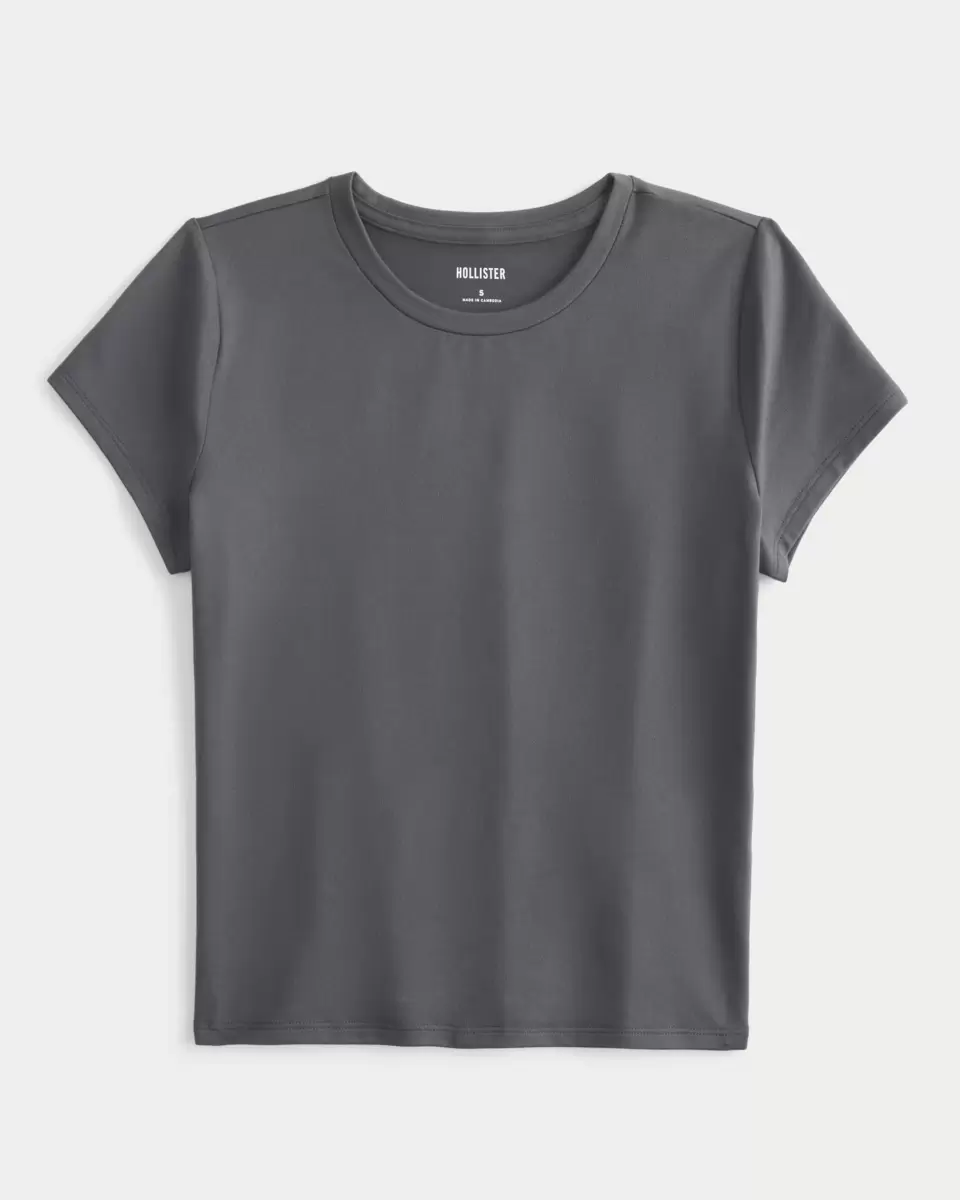 Cute and comfy, this baby tee is made with soft stretch fabric with a seamless look and feel. Crew neckline, short sleeves. Slim Fit.