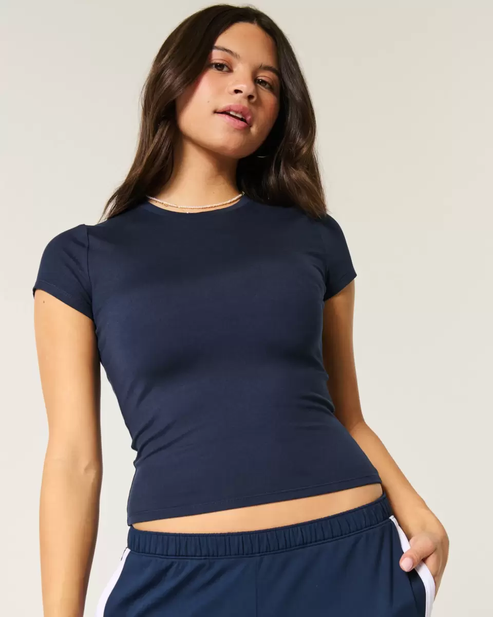 Cute and comfy, this baby tee is made with soft stretch fabric with a seamless look and feel. Crew neckline, short sleeves. Slim Fit.